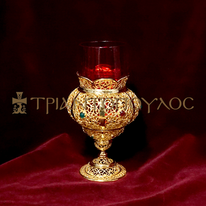 Ornate Altar Silver gilded vigil lamp with semiprecious stones and gold decoration K24. Net height: 15 cm without a cup, height with the cup: 19 cm, diameter: 9.5 cm.