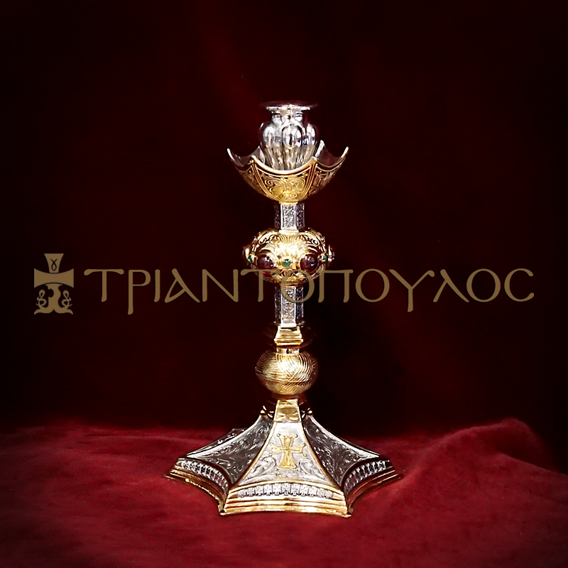 Silver gilded ornate candle stick with semi precious stones, gold decoration K24. Height: 23cm, base diameter: 13.50cm