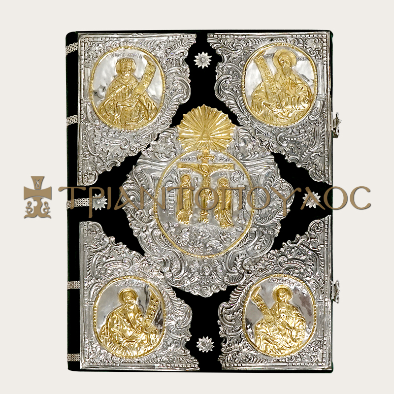 Ασημένιο Ευαγγέλιο με διακοσμήσεις χρυσού Κ24. Διαστάσεις 33cm x 27cm.