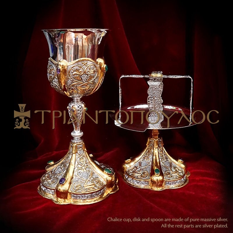Chalice cup, disk and spoon are made of pure massive silver. All the rest parts are silver plated.