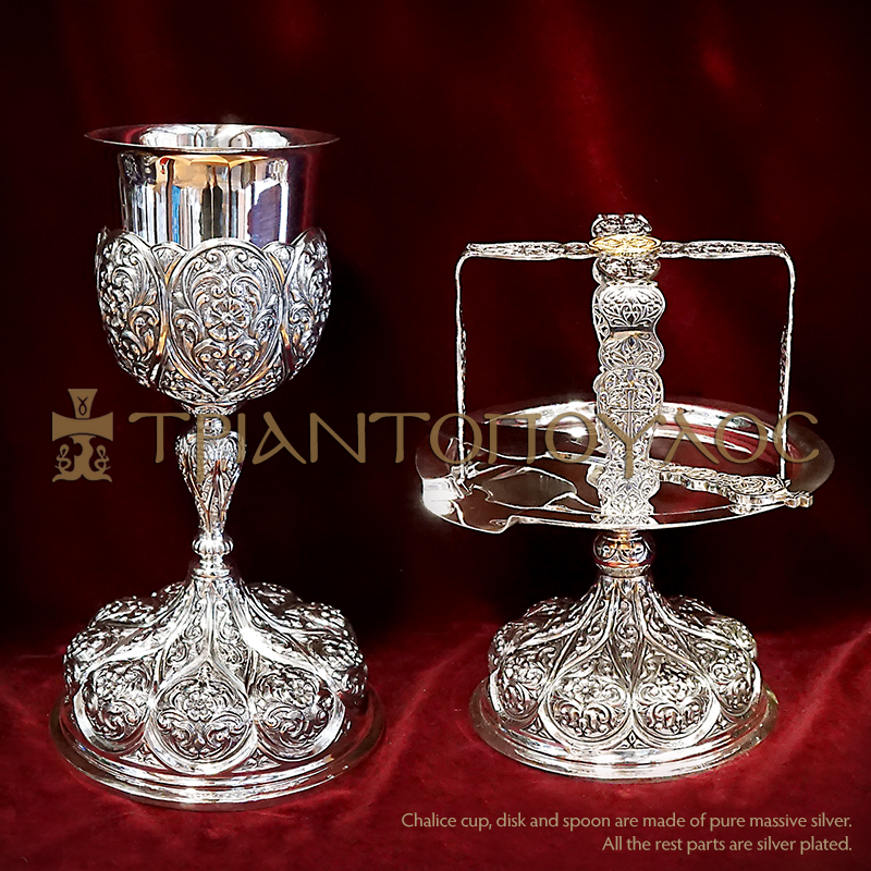 Chalice cup, disk and spoon are made of pure massive silver. All the rest parts are silver plated.