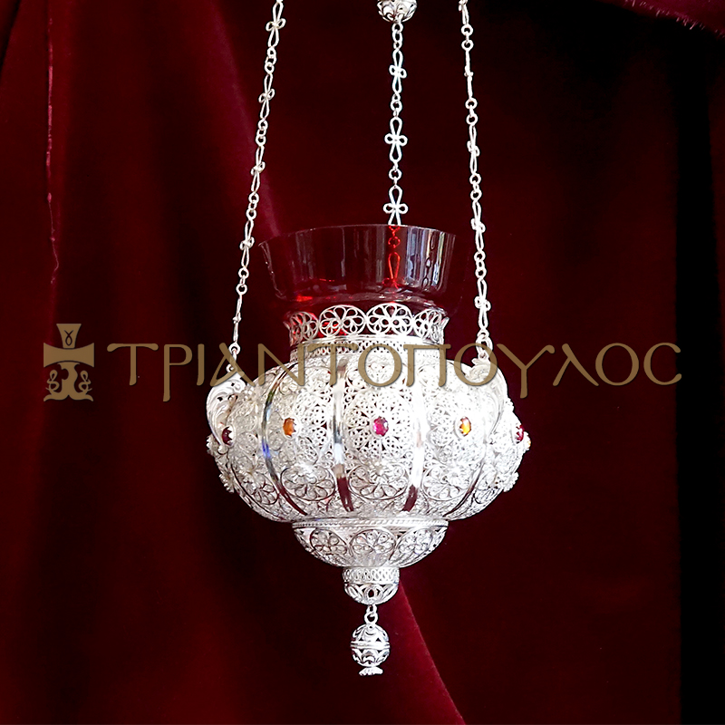 Περίτεχνο πολύ φαρδύ ασημένιο καντήλι φιλιγκράν με φουσκώματα με ημιπολύτιμες πέτρες. Ύψος 21 εκ, διάμετρος 17εκ.