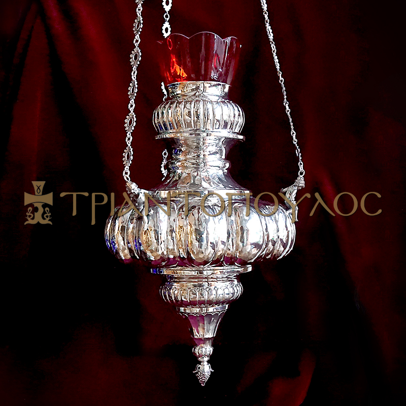 Очень большой подвесной посеребренный подсвечник, выполненный по образцу старинного патмосского подсвечника, богато украшен замысловатыми рельефами и деталями в стиле барокко.